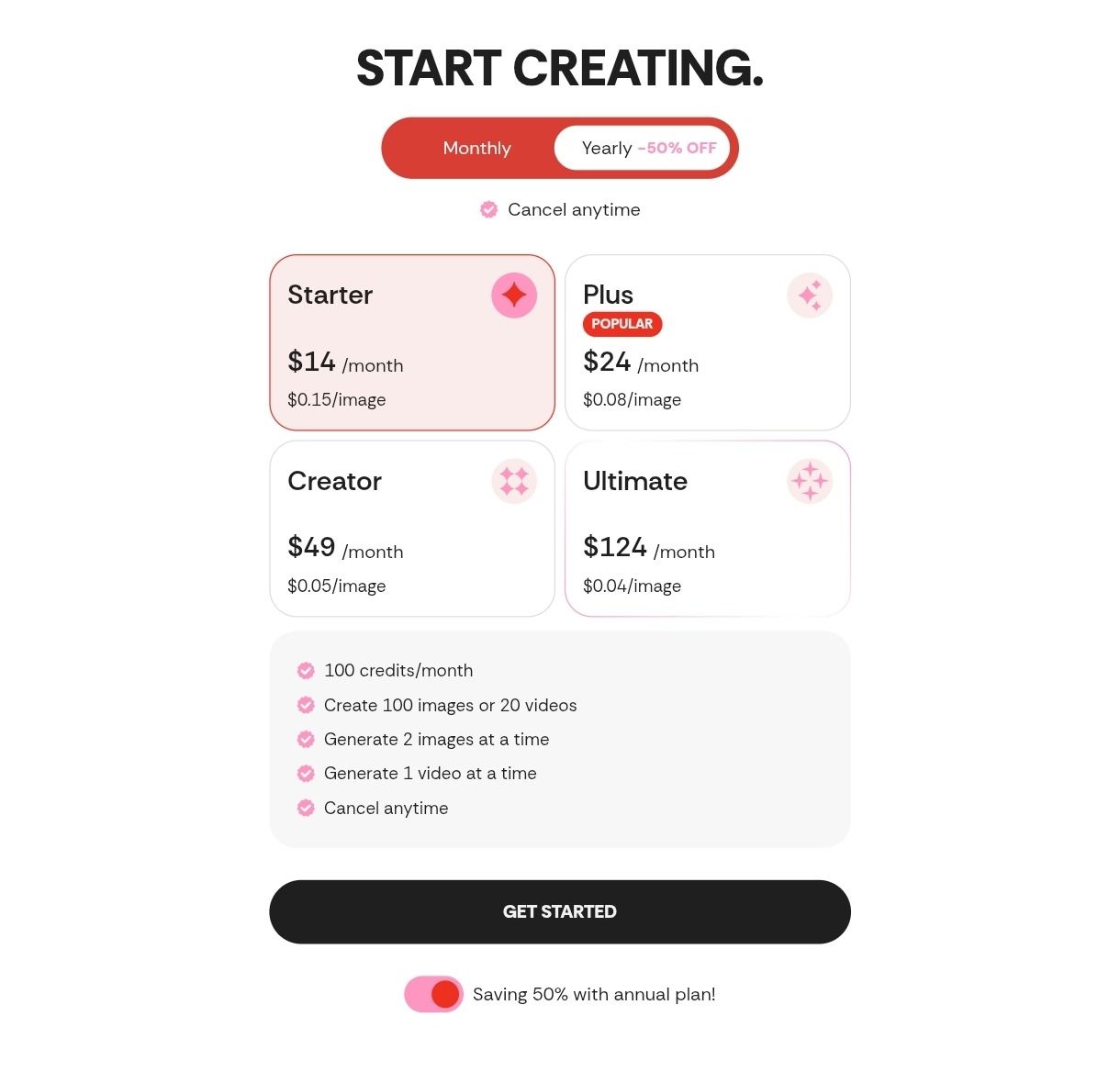 Starter ($14/month): 100 images and 20 videos per month. Unlikely to meet the needs of any working creator — at this volume, credits run out fast once you factor in retries, batch testing, and natural creative experimentation.